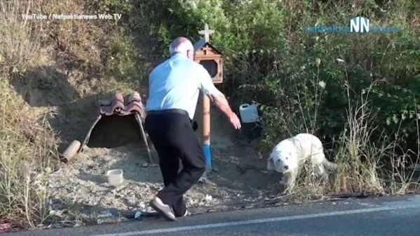 Nafpaktia News reported that the dog’s owner was killed by a cement mixer on November 8, 2017 in a Greek town on a remote road. Since that time the dog has stayed at the accident scene. He only moves away to find shade in the hot sun.