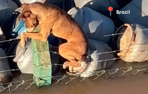 La tripulación de un barco que entraba en un puerto notó a un perro callejero en una posición precaria al llegar al puerto. El perro estaba atrapado en una cerca de alambre de púas que separaba los peligrosos contenedores metálicos del agua. De inmediato se dispusieron a ayudar al pobre animal.