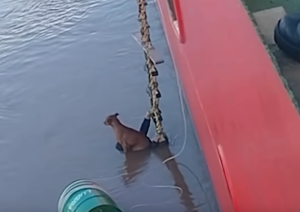 Cuando el perro y el hombre llegaron al costado del bote, se enfrentaron a otro desafío: cómo subir al perro por la escalera de cuerda. El tripulante intentó subir con el perro varias veces, pero fracasó en cada intento. Hubo momentos de tensión, ya que el perro no entendía bien qué estaba pasando. Finalmente, cuando el hombre lo intentó de nuevo, el perro pareció querer cooperar. Pero trabajando juntos, el equipo encontró una solución.