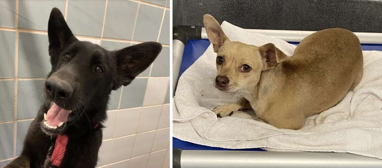 Concerned, the staffer approached the soaking wet tarp and lifted it up. What they found was heartbreaking — two German shepherds and a small Chihuahua, abandoned in cages beneath the large sheet of plastic.