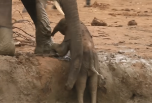 Meanwhile, the herd has not abandoned baby. Mamma elephant puts in her best efforts to pull her baby out, using her trunk and forefeet to try and raise the calf bodily onto safe ground. She fails after each attempt.