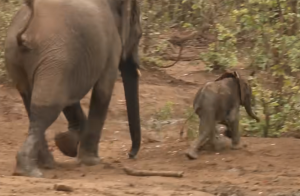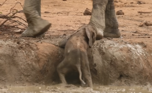 Footage captured at South Africa’s Kruger National Park shows a tiny baby elephant stuck in a shallow ditch of muddy water. The video shows the calf, just a couple months old, struggling to find its way back out to its mamma – but the poor thing is so little, it just can’t pull itself out of the hole.
