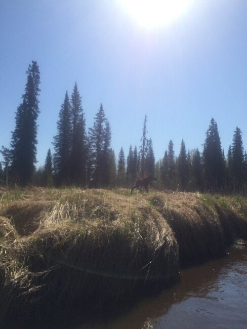 Along both sides of the river, the bank rose sharply, making it all but impossible for the moose calf to climb out.