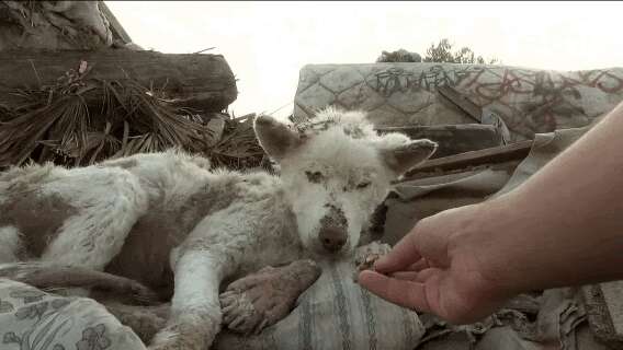A continuación se muestra una foto de Miley en su primer día de curación. Cubierta de sarna y varias infecciones, le quedaba un largo camino por recorrer.Esperar en balde