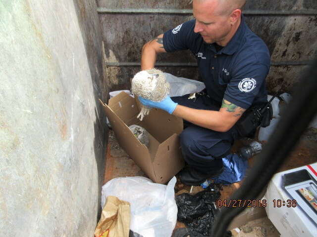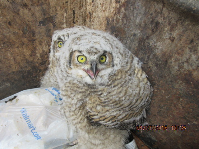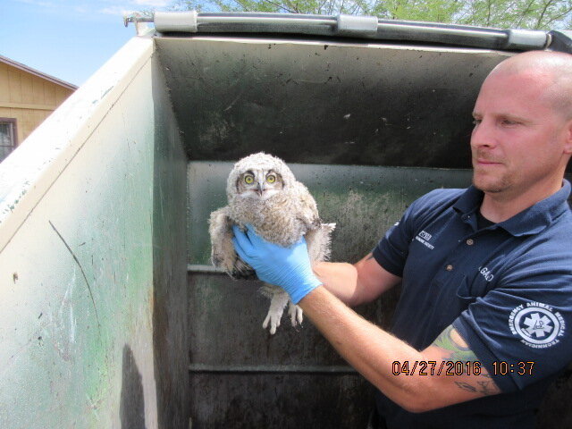 Andy Gallo from AHS arrived promptly and, without hesitation, climbed into the dumpster to retrieve the young owls.