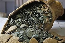 Un granjero suizo descubrió en su huerto de cerezos un tesoro escondido de 4.166 monedas romanas de bronce y plata cuando notó algo que brillaba en un grano de arena. El tesoro se llama uno de los tesoros más grandes jamás descubiertos en Suiza.