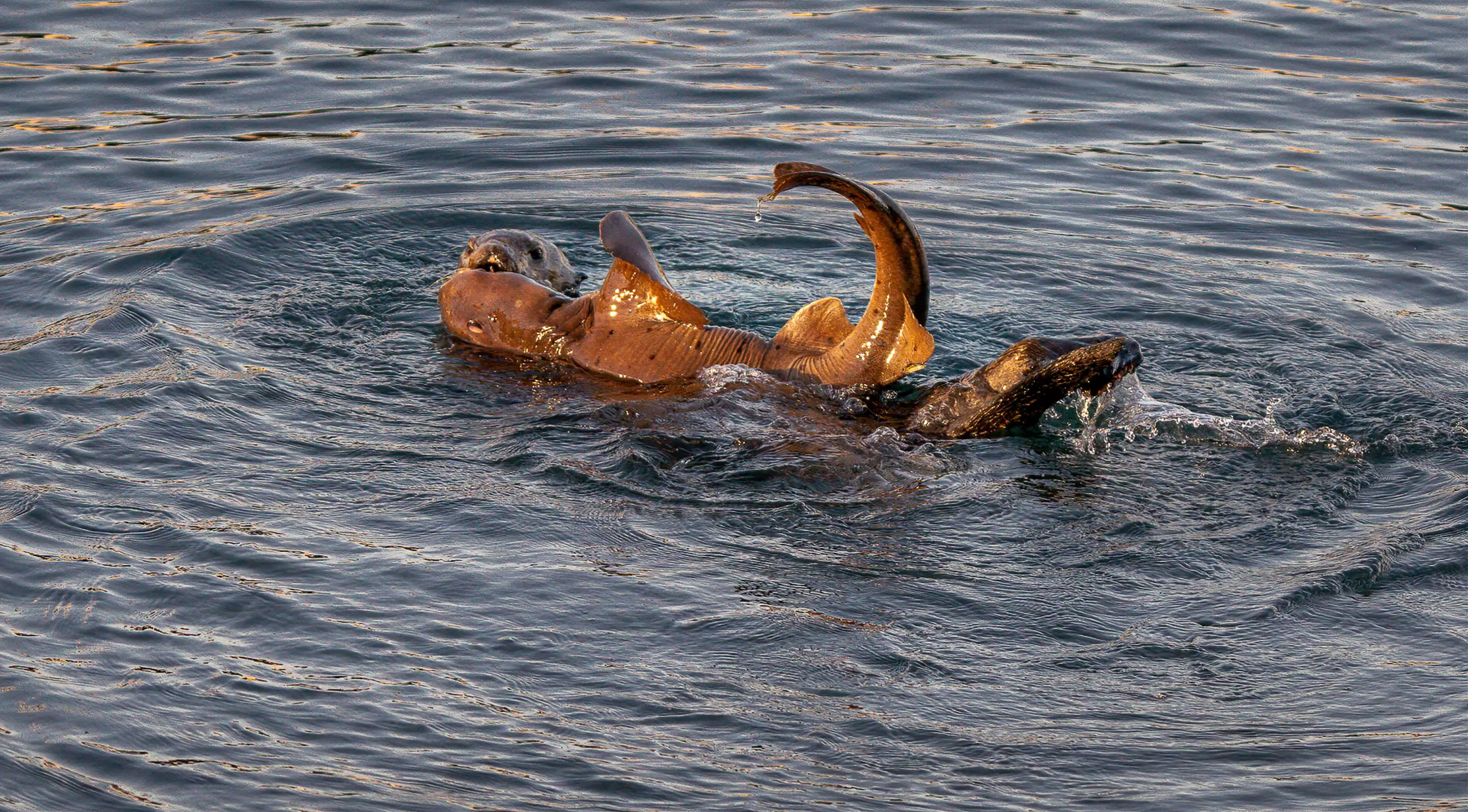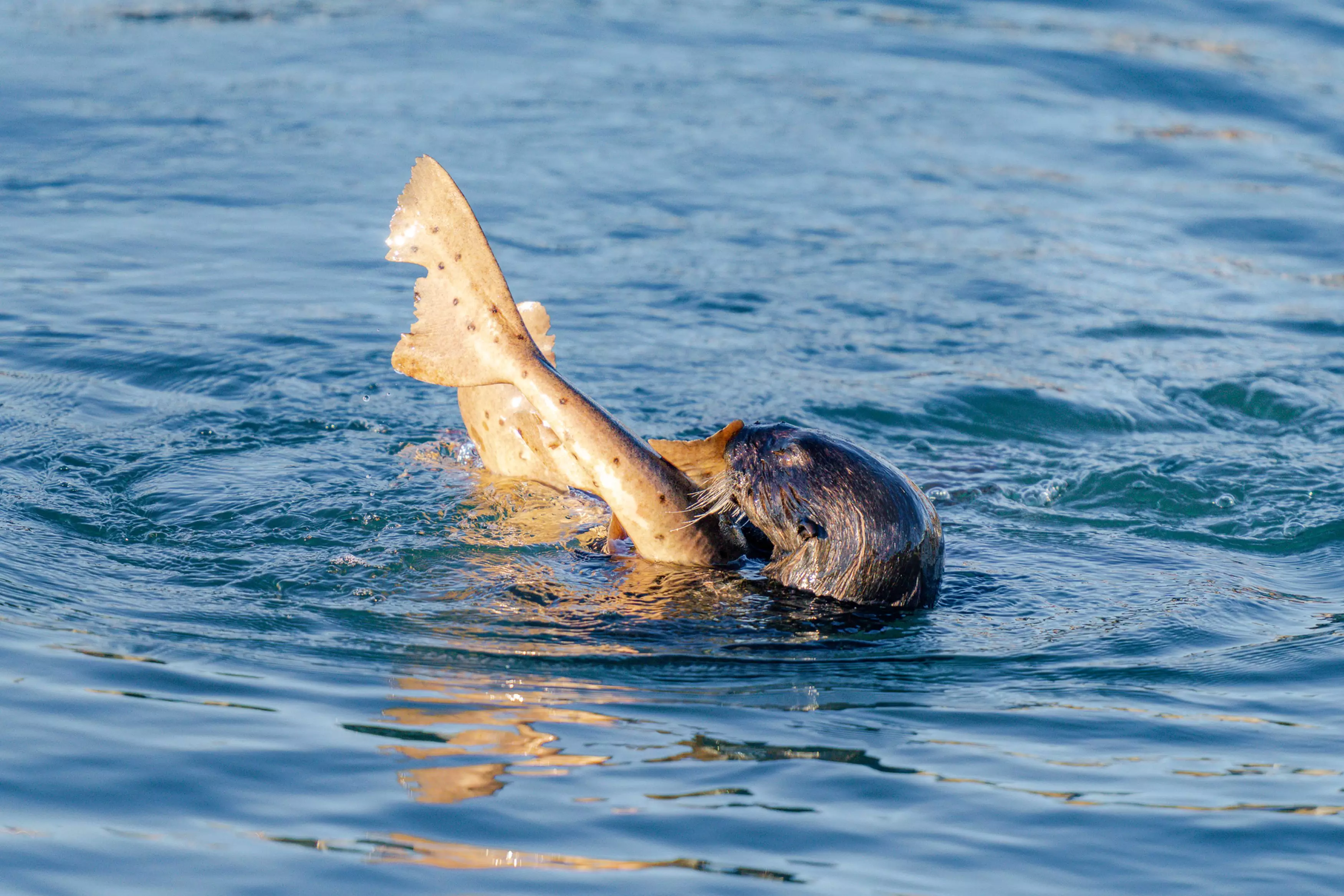 Rather than carrying one of its usual foods of clams or crabs, the Southern sea otter was snapped holding on to a horned shark.