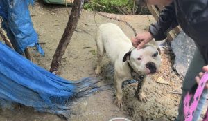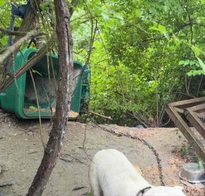 Encadenado a un bote de basura en el bosque, el perro más maloliente lloraba, sin entender por qué lo dejaron allí.