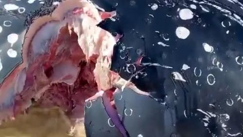 The poor creature has a huge piece of flesh missing, perhaps from a shark attack or a mishap with a boat.