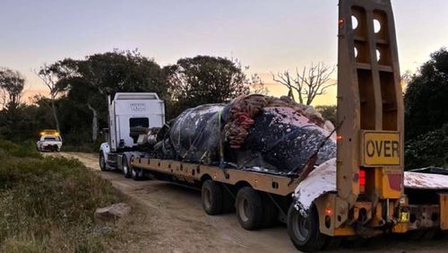 Officials from the NSW Department of Planning and Environment said they have been working to remove it from the beach, and the carcass was later seen being driven from the beach on the back of a semi-trailer.