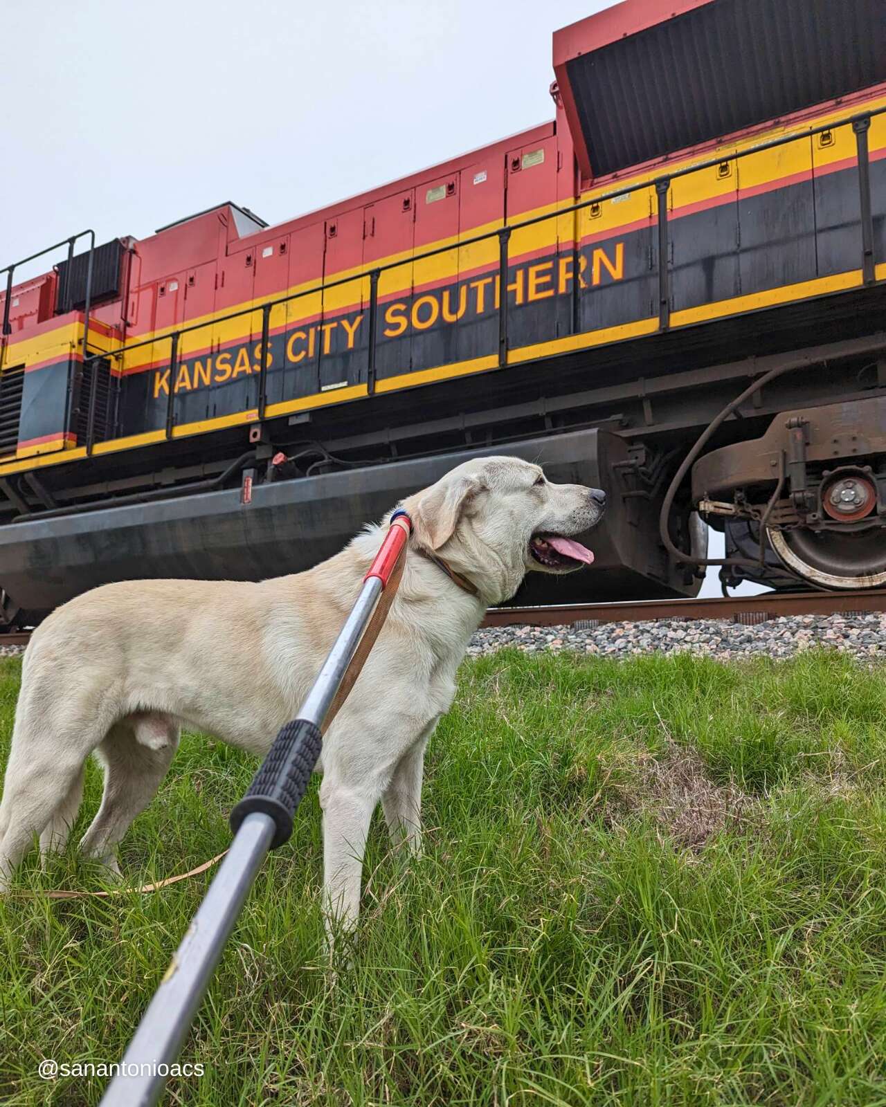 “Officer Edwards moved quickly and safely, helping Lucky off the tracks,” SAACS wrote. “Before they could make it back to the animal transport vehicle, a train zoomed past!”