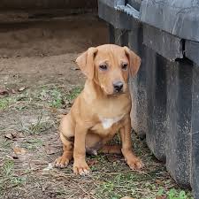 Samboya, Gambia, Africa, April 20, 2019, Horn photo of a Brown and White dog puppy standing by a Blue kettle, outdoors on a sunny day