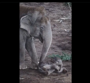 In the video, a tiny baby elephant is seen peacefully sleeping, completely unaware of the world around it. Next to the sleeping youngster stands an adult elephant, gently nudging the baby in an attempt to wake it from its deep slumber. Still in a sleepy daze, the baby elephant struggles a little as it tries to stand up, looking utterly adorable in the process.