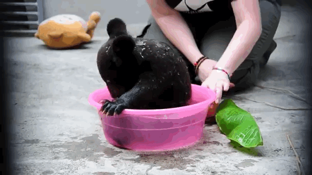 Now, bears like Smudge get to rehab with a paddling pool, stuffed teddy bear, climbing frame and straw bedding. There’s a lot to learn in the transition….like…..