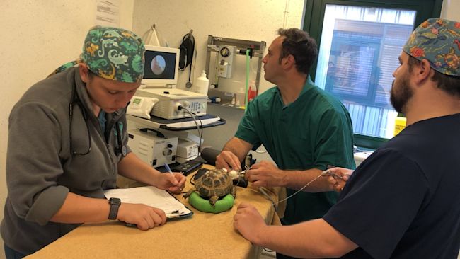 “A segment of his shell was removed from his plastron to perform an exploratory laparotomy and the screws were located in the colon.
