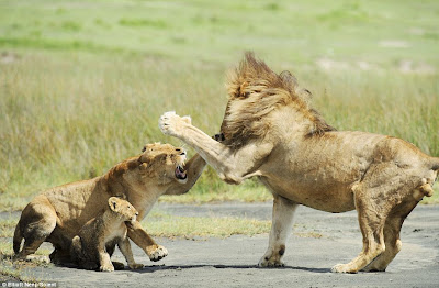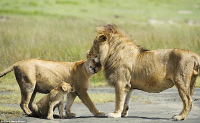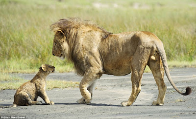 The cub had been sunbathing on the bed of a dried up marsh in the Serengeti National Park, Tanzania, when he was disturbed by his father.