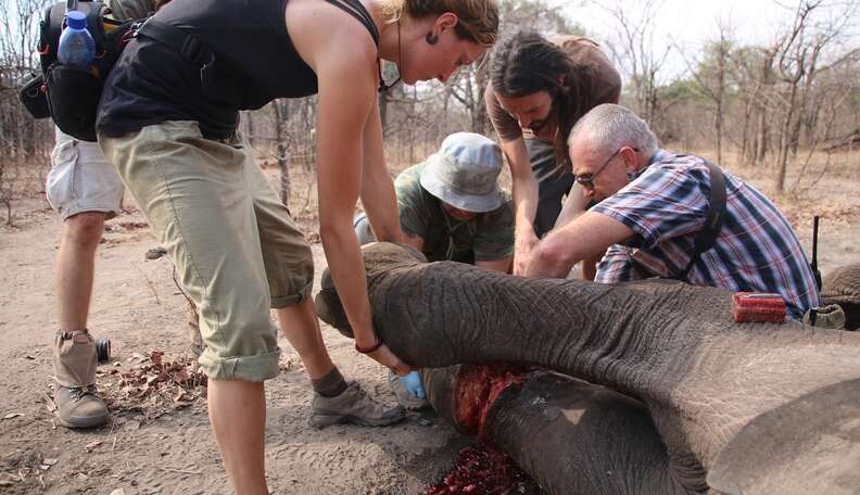 Veterinarian Amanda Salb of Lilongwe Wildlife Trust and Derek Macpherson of Cluny Wildlife Trust teamed up with the Rhino Protection Team and African Parks scouts to tranquilize the suffering animal and remove the gory snare. Then they set to healing the wound it had left.