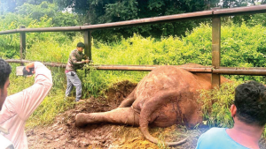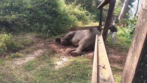 A female wild elephant aged approximately 25 years had entered into the estate limits at Valnuru-Tyagathuru. It is suspected that the elephant might have successfully crossed the railway barricade to reach the village.