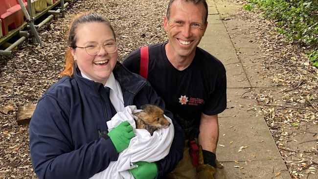 A baby fox was rescued by firefighters after it was found trapped in an underground pipe.
