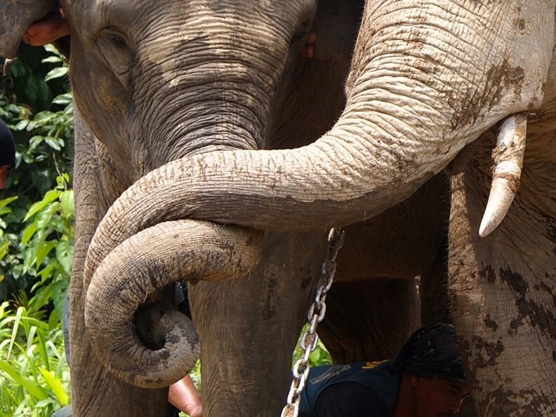 Suria is a trained elephant for the National Elephant Conservation Center, Department of Wildlife and National Parks, a government organization that relocates wild elephants causing problems in human inhabited areas. The goal is both to protect village crops and to dissuade villagers from poisoning or otherwise harming the pesky pachyderms, as happened in Indonesia last year.