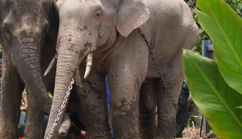 When at last after three exhausting days of tranquilizers and mud he stood swaying on the back of a truck destined for the national forest, Suria leaned in close, swung her trunk around and began lightly massaging his nose. He responded by twisting his trunk tightly around hers, clinging to her like a drowning victim.