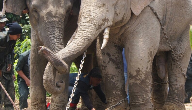 When at last after three exhausting days of tranquilizers and mud he stood swaying on the back of a truck destined for the national forest, Suria leaned in close, swung her trunk around and began lightly massaging his nose. He responded by twisting his trunk tightly around hers, clinging to her like a drowning victim.